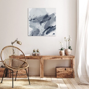 - Obraz przedstawia abstrakcyjne plamy w odcieniach niebieskiego na jasnym tle. Minimalistyczna kompozycja dodaje wnętrzom spokoju i elegancji.
