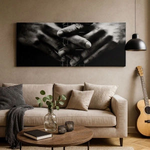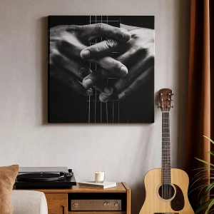 - Czarno-białe przedstawienie splecionych dłoni spoczywających na gitarze. Obraz o wyjątkowym wyrazie, idealny do wnętrz pełnych harmonii i stylu. Wspaniała dekoracja do salonu, sypialni lub gabinetu.
