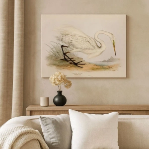 - Subtelny rysunek białej czapli na tle naturalnego krajobrazu, pełen elegancji i spokoju. Idealny do wnętrz o minimalistycznym i klasycznym charakterze.