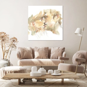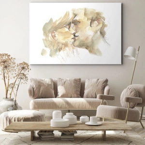 - Obraz ukazuje subtelny akwarelowy portret pary w chwili pocałunku. Pastelowe kolory i delikatny styl nadają dziełu romantyczny i elegancki charakter, idealnie pasujący do nowoczesnych wnętrz.