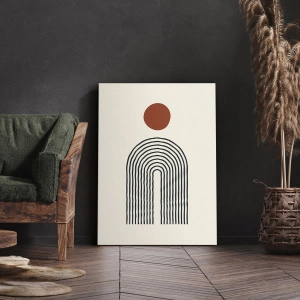 - Nowoczesny obraz z abstrakcyjnym wzorem linii i czerwonym okręgiem. Minimalistyczna kompozycja idealna do wnętrz w nowoczesnym stylu, podkreślająca prostotę i harmonię.