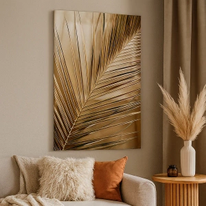- Złota liść palmy na jednolitym tle. Minimalistyczna i elegancka kompozycja, idealna do wnętrz w nowoczesnym i tropikalnym stylu, dodająca subtelności i luksusu.