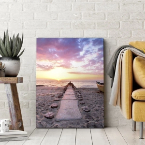 Obraz na płótnie - Plaża o wschodzie słońca z łodzią i pomostem - 100x70cm - Chwila głębokiego przeżycia - Nowoczesna dekoracja ścienna do salonu, kuchni i sypialni ARTTOR