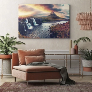 Obraz na płótnie - Widok na wodospad i górę w świetle zachodzącego słońca - 100x70cm - W majestacie przyrody - Nowoczesna dekoracja ścienna do salonu, kuchni i sypialni ARTTOR