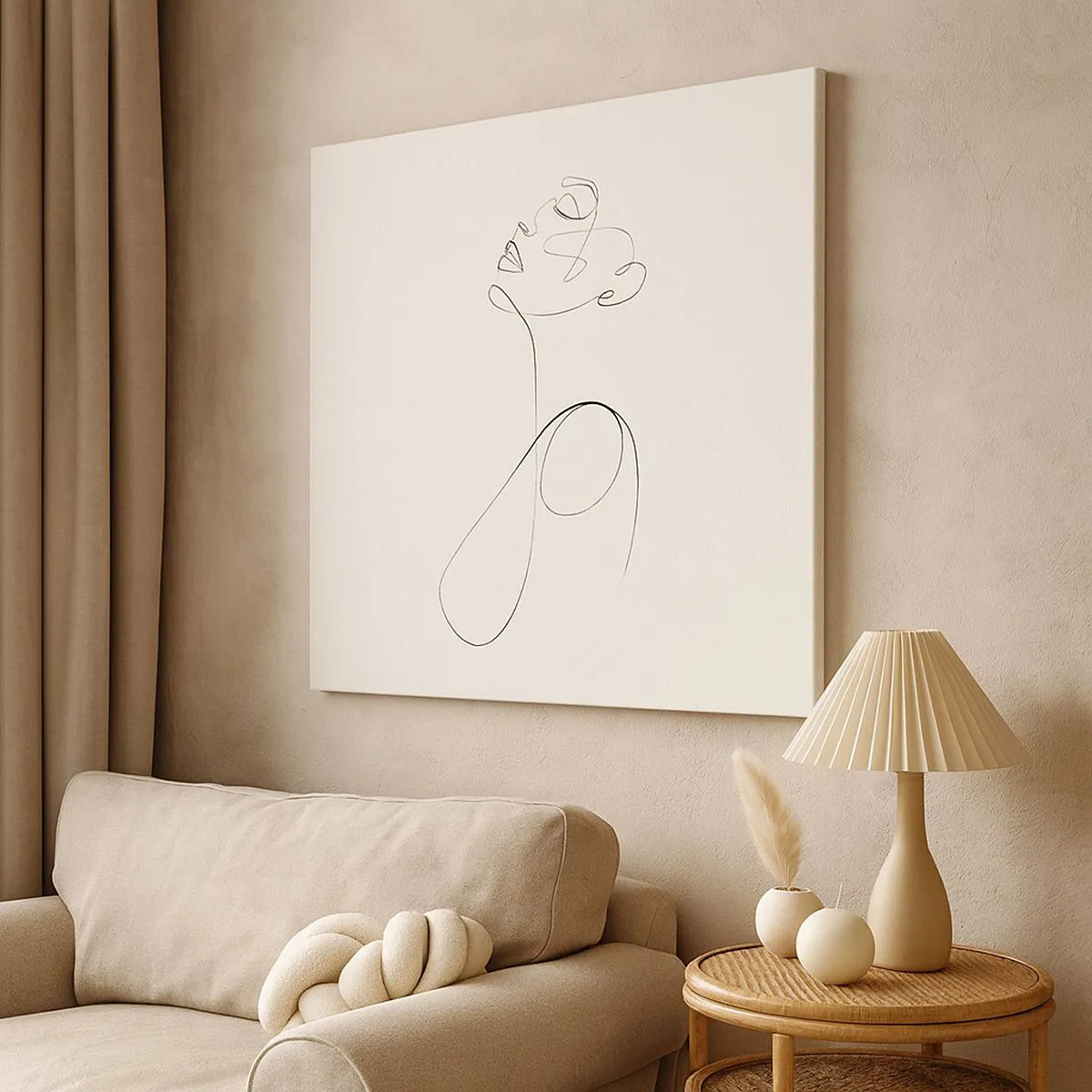 - Minimalistyczny obraz z twarzą w stylu line art na białym tle. Nowoczesna dekoracja ścienna, która wprowadza do wnętrza subtelność i artystyczny charakter.