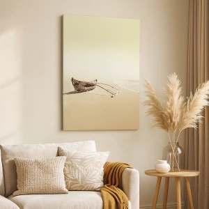- Obraz przedstawiający starą łódź rybacką na piaszczystej plaży. Dekoracja ścienna w minimalistycznym stylu, która wprowadza do wnętrza harmonię i nostalgię.