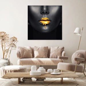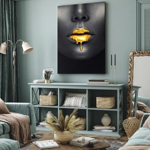 Obraz na płótnie - Czarno-złoty portret kobiety z kroplą złota na ustach - 100x70cm - Złotousta - Nowoczesna dekoracja ścienna do salonu, kuchni i sypialni ARTTOR