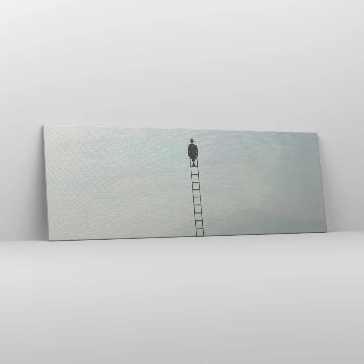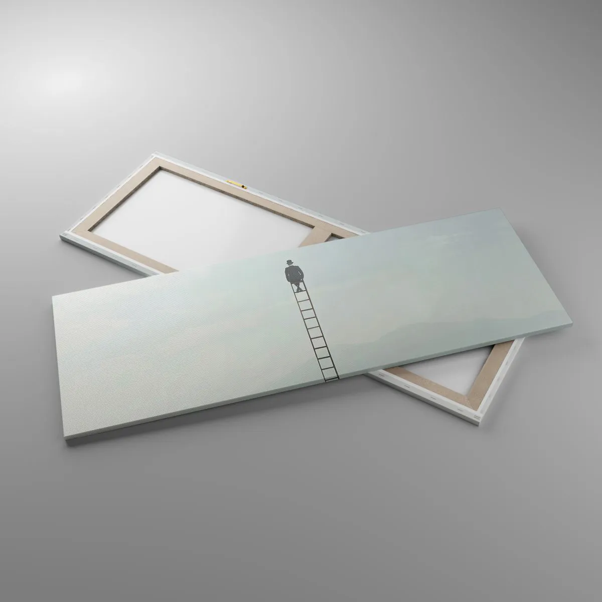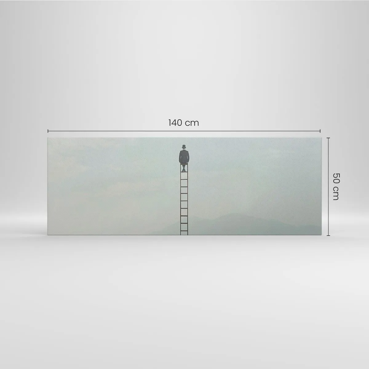 Obraz na płótnie - Mężczyzna na drabinie wznoszącej się w niebo - 140x50cm - Wznieś się ponadto - Nowoczesna dekoracja ścienna do salonu i sypialni ARTTOR