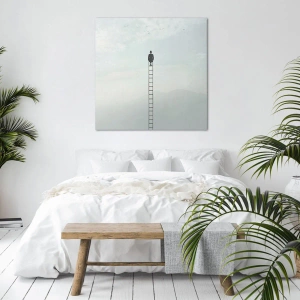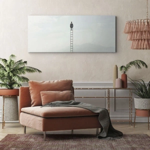 Obraz na płótnie - Mężczyzna na drabinie wznoszącej się w niebo - 160x50cm - Wznieś się ponadto - Nowoczesna dekoracja ścienna do salonu i sypialni ARTTOR