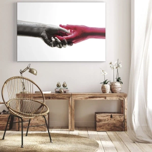Obraz na płótnie - Symboliczne dłonie w srebrnym i czerwonym kolorze - 70x50cm - Razem, choć inni - Nowoczesna dekoracja ścienna do salonu i sypialni ARTTOR