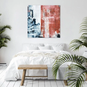 Obraz na płótnie - Abstrakcja w biało-niebieskich i ceglanych barwach - 160x50cm - Abstrakcyjne pół na pół - Nowoczesna dekoracja ścienna do salonu i sypialni ARTTOR
