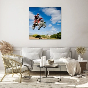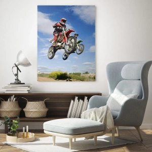 Obraz na szkle - Zawodnicy na motocyklach crossowych w powietrzu podczas skoku - 80x120cm - Podniebny skok - Nowoczesna dekoracja ścienna do salonu i sypialni ARTTOR