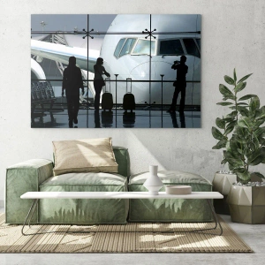 Obraz na szkle - Lotnisko z widokiem na samolot i sylwetki podróżnych - 50x70cm - Vis a vis na lotnisku - Nowoczesna dekoracja ścienna do salonu, kuchni i sypialni ARTTOR