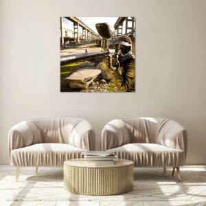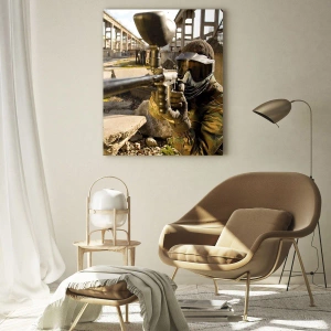 Obraz na szkle - Gracz paintballa w stroju kamuflażowym celujący z markera - 120x50cm - I ty możesz zostać bohaterem - Nowoczesna dekoracja ścienna do salonu i sypialni ARTTOR