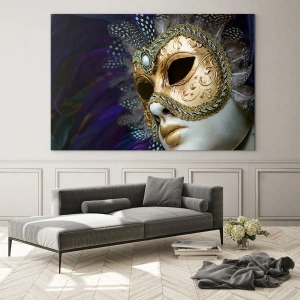 Obraz na szkle - Złota maska wenecka z ozdobnymi piórami i ornamentami - 160x50cm - Portret wenecki w złocie - Nowoczesna dekoracja ścienna do salonu i sypialni ARTTOR