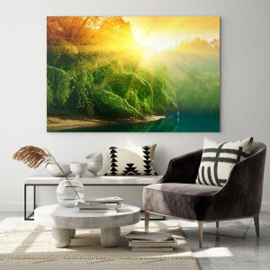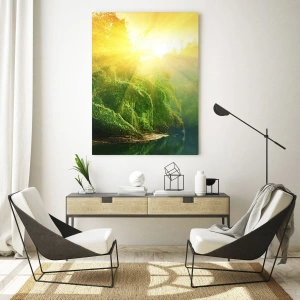 Obraz na szkle - Zielony las nad rzeką oświetlony promieniami wschodzącego słońca - 80x120cm - Utonąć w słońcu i w cieniu - Nowoczesna dekoracja ścienna do salonu i sypialni ARTTOR