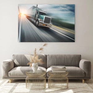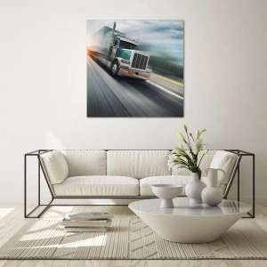 Obraz na szkle - Ciężarówka na autostradzie w ruchu przy zachodzie słońca - 70x100cm - Amerykański olbrzym w pędzie - Nowoczesna dekoracja ścienna do salonu i sypialni ARTTOR