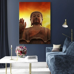 Obraz na szkle - Posąg Buddy na tle złocistego zachodu słońca - 50x70cm - Spokój świata - Nowoczesna dekoracja ścienna do salonu, kuchni i sypialni ARTTOR