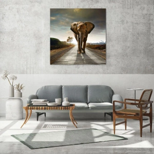 Obraz na szkle - Słoń kroczący drogą wśród krajobrazu o zachodzie słońca - 70x100cm - I wcale nie w składzie porcelany - Nowoczesna dekoracja ścienna do salonu i sypialni ARTTOR