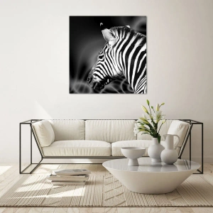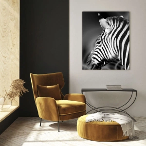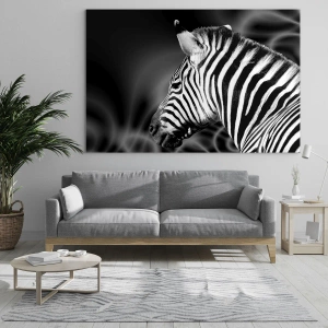 Obraz na szkle - Czarno-biały portret zebry na tle abstrakcyjnych wzorów. - 70x100cm - Białe jest białe, a czarne jest czarne - Nowoczesna dekoracja ścienna do salonu i sypialni ARTTOR