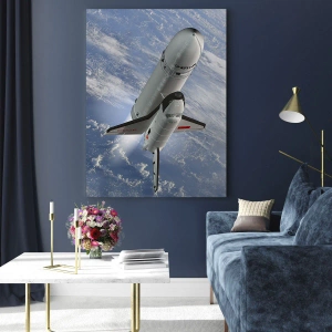 Obraz na szkle - Prom kosmiczny startujący na tle Ziemi w przestrzeni kosmicznej - 50x70cm - Kosmiczne wniebowstąpienie - Nowoczesna dekoracja ścienna do salonu, kuchni i sypialni ARTTOR