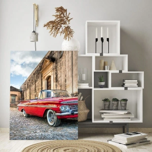 Obraz na szkle - Klasyczny czerwony kabriolet na brukowanej ulicy w scenerii retro - 120x80cm - Kubańskie wzruszenia - Nowoczesna dekoracja ścienna do salonu, kuchni i sypialni ARTTOR