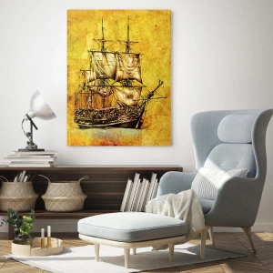 Obraz na szkle - Zabytkowy żaglowiec na tle stylizowanego pergaminu - 50x70cm - Kierunek Tortuga! - Nowoczesna dekoracja ścienna do salonu, kuchni i sypialni ARTTOR