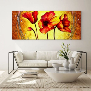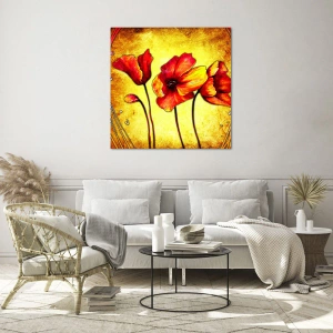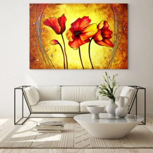 Obraz na szkle - Czerwone maki na tle złocistych odcieni z artystycznymi detalami - 50x70cm - W secesyjnej dekoracji - Nowoczesna dekoracja ścienna do salonu, kuchni i sypialni ARTTOR