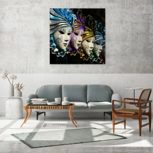 Obraz na szkle - Kolorowe weneckie maski w rzędzie - 100x70cm - Tajemnica w złocie i w srebrze - Nowoczesna dekoracja ścienna do salonu, kuchni i sypialni ARTTOR