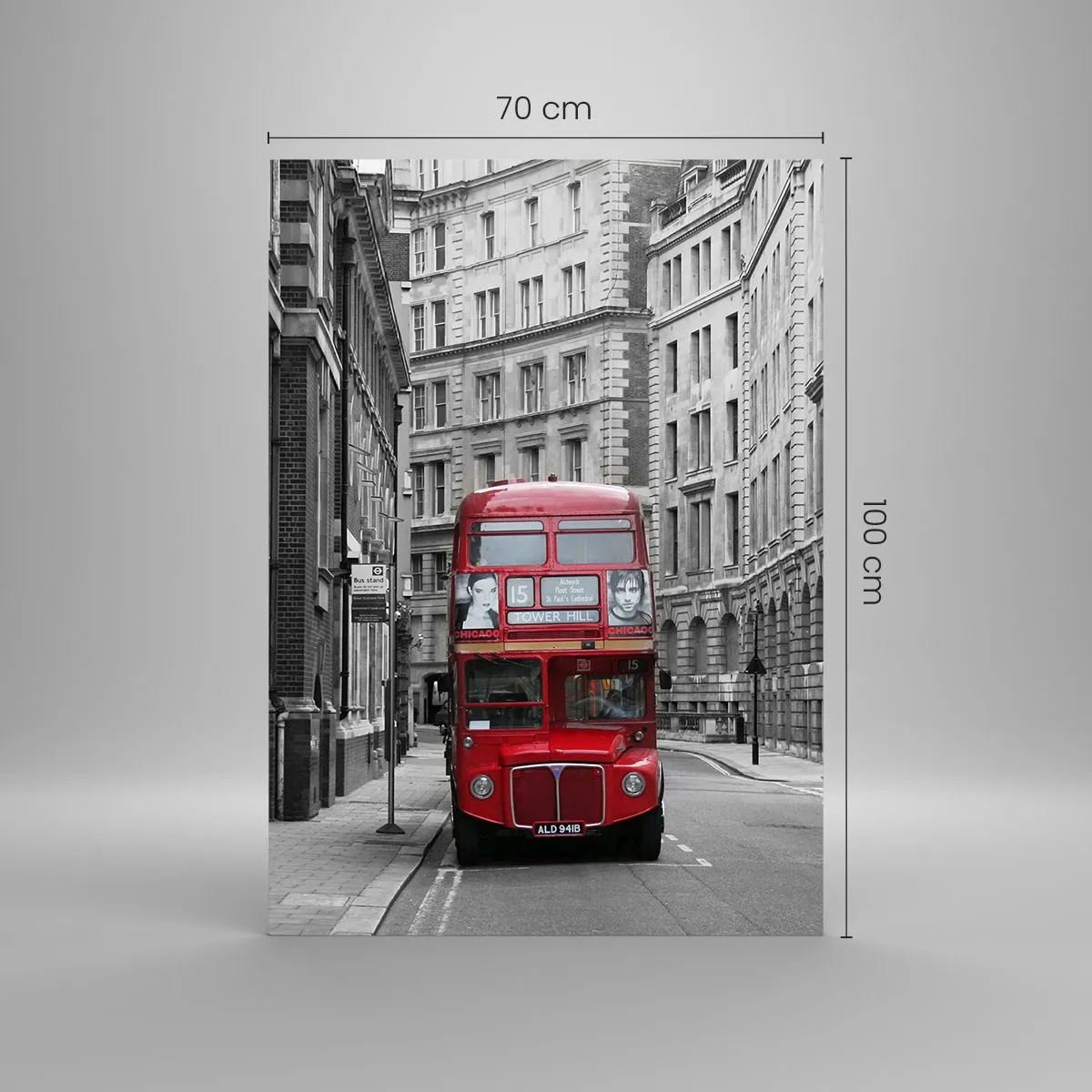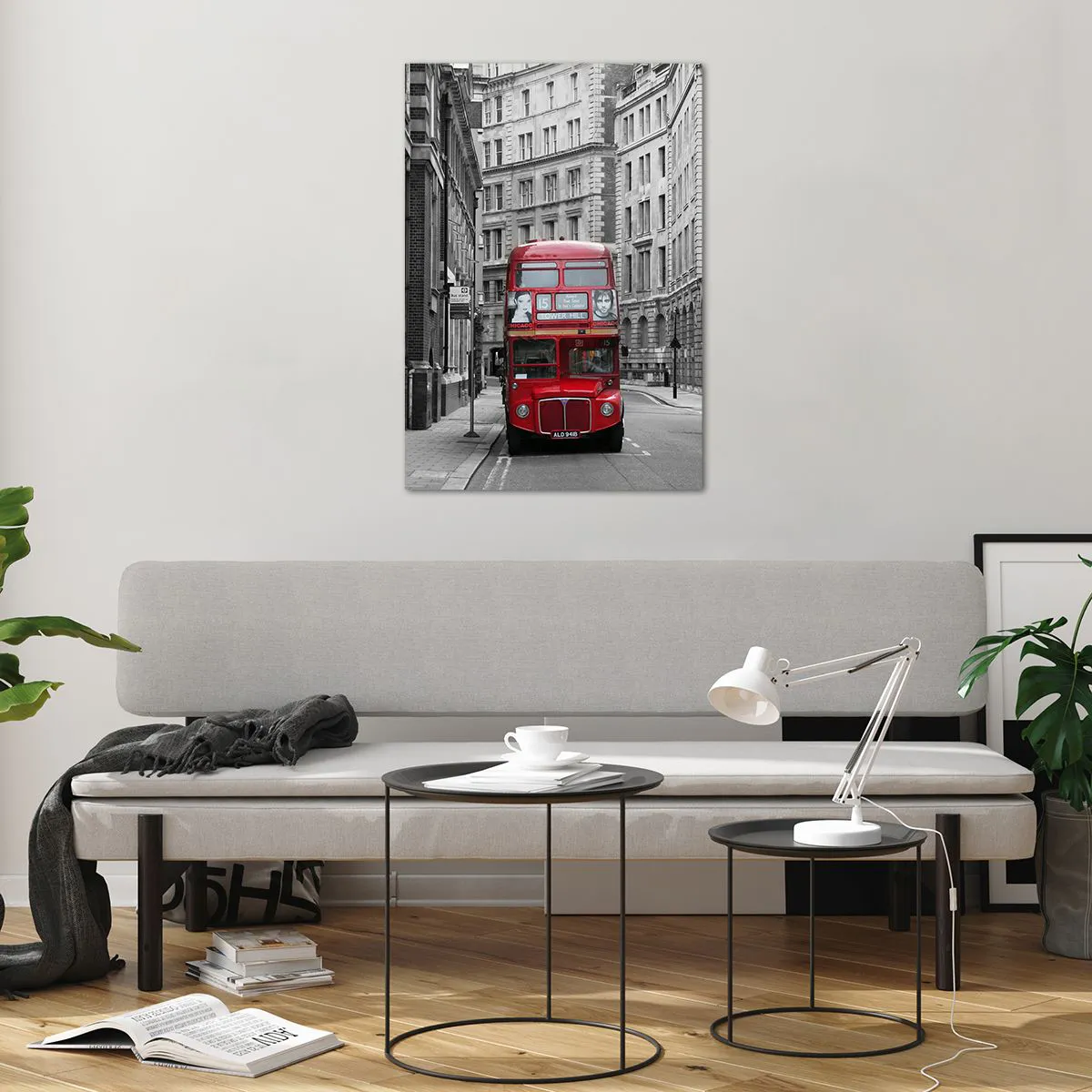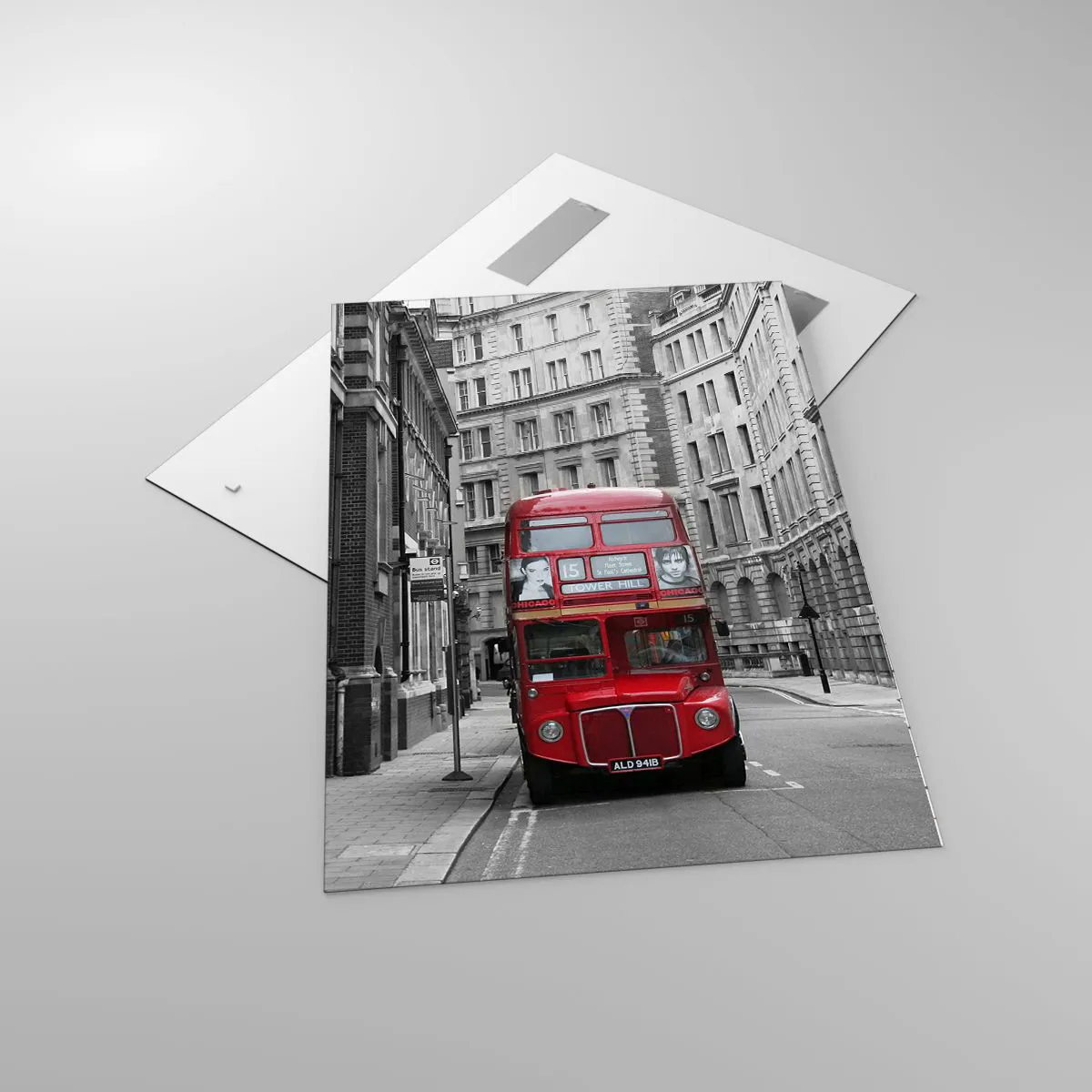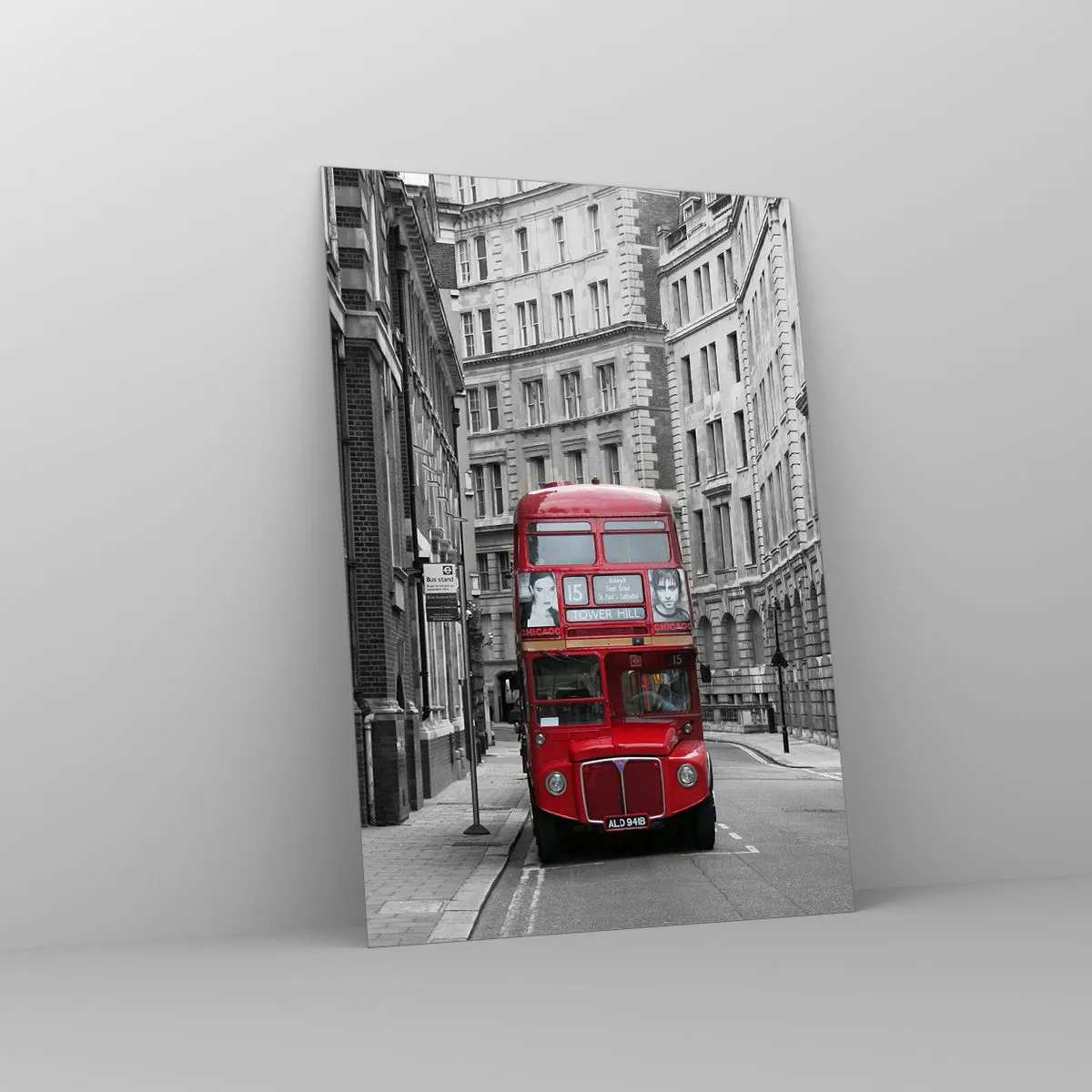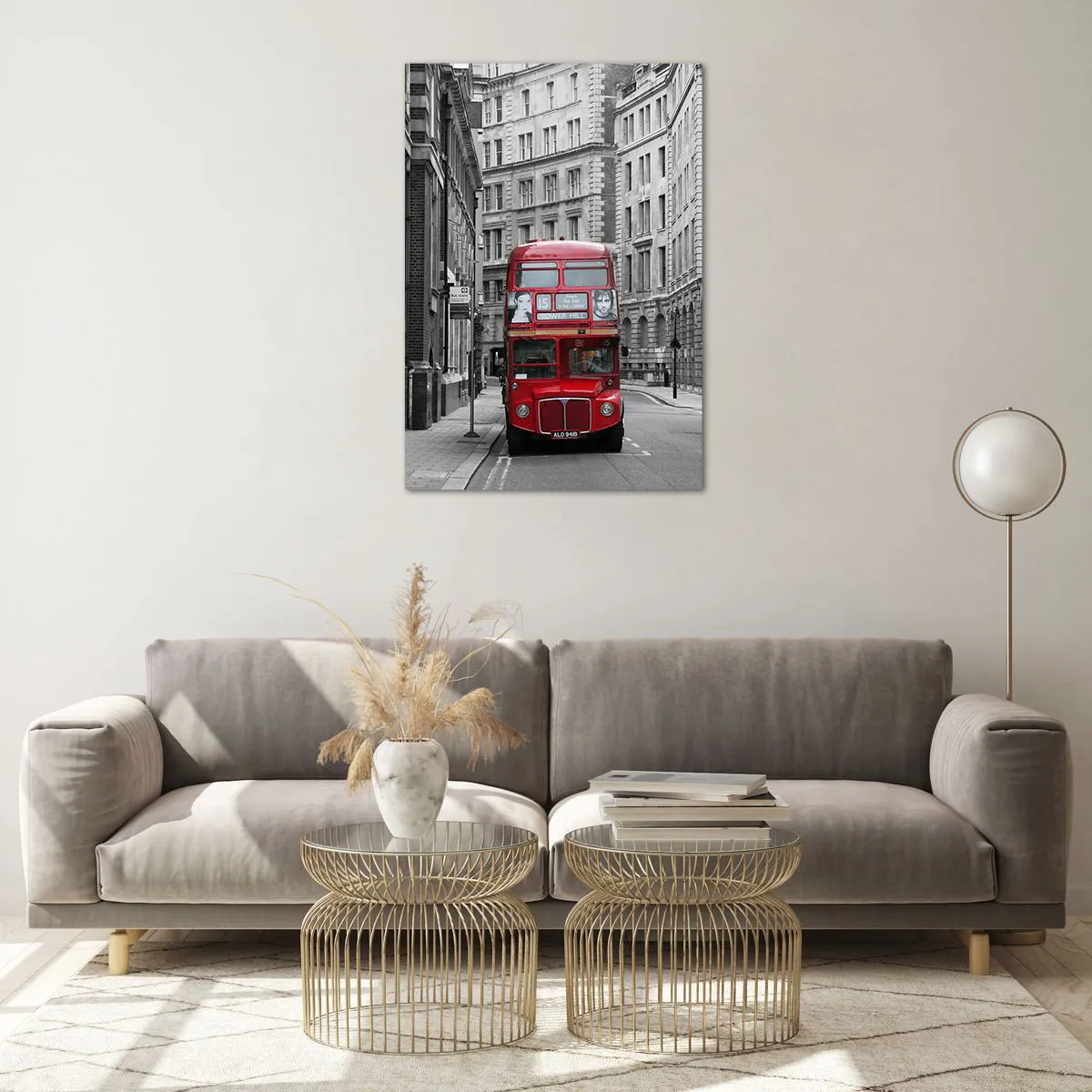 Obraz na szkle - Czerwony autobus na tle czarno-białych budynków miejskich - 70x100cm - Codzienność nie musi być szara - Nowoczesna dekoracja ścienna do salonu i sypialni ARTTOR