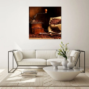 Obraz na szkle - Stary młynek do kawy z ziarnami i workiem w rustykalnym stylu - 80x120cm - Martwa natura z ziarnami kawy i młynkiem - Nowoczesna dekoracja ścienna do salonu i sypialni ARTTOR