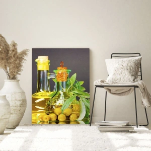 Obraz na szkle - Butelki oliwy z oliwek i gałązki drzewa oliwnego - 80x120cm - Martwa natura z oliwkami i oliwą - Nowoczesna dekoracja ścienna do salonu i sypialni ARTTOR