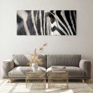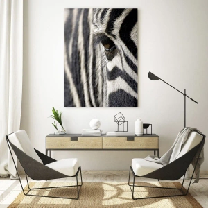 Obraz na szkle - Zbliżenie na oko zebry i czarno-białe paski - 50x70cm - Portret w paski - Nowoczesna dekoracja ścienna do salonu, kuchni i sypialni ARTTOR