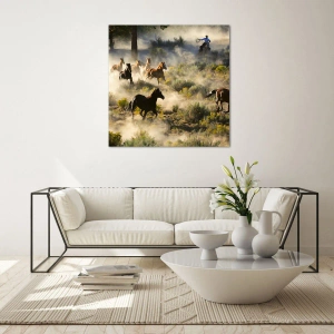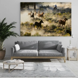 Obraz na szkle - Stado dzikich koni galopujących przez kurz i roślinność - 80x120cm - Rywalizacja - wolność czy męska siła? - Nowoczesna dekoracja ścienna do salonu i sypialni ARTTOR
