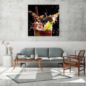 Tematyka obrazu, związana z napojami i ich orzeźwiającym charakterem, jest doskonałym wyborem dla osób ceniących nowoczesne i stylowe rozwiązania dekoracyjne. Rozprysk kropli oraz refleksy światła na szkle dodają kompozycji życia i tworzą unikalny efekt wizualny, który sprawdzi się w każdym wnętrzu.
