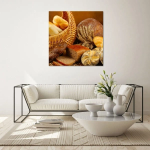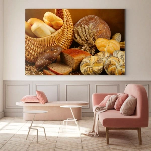 Obraz na szkle - Kosz z pieczywem i bochenki na tle kłosów zboża - 100x70cm - Znowu się nam upiekło - Nowoczesna dekoracja ścienna do salonu, kuchni i sypialni ARTTOR