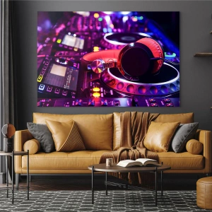 Obraz na szkle - Słuchawki DJ na konsolecie w neonowym oświetleniu - 70x100cm - Zanim się zacznie zabawa - Nowoczesna dekoracja ścienna do salonu i sypialni ARTTOR