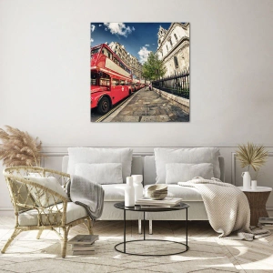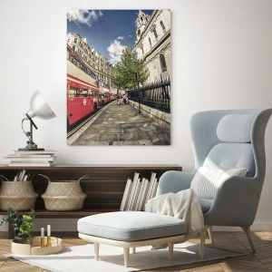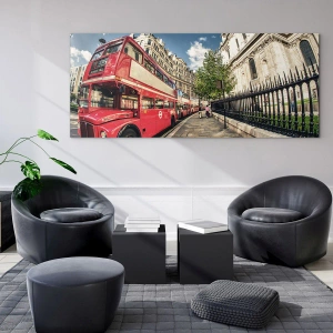 Obraz na szkle - Czerwony piętrowy autobus w Londynie przy ulicy i katedrze - 120x50cm - Londyńska ulica w szarości i czerwieni - Nowoczesna dekoracja ścienna do salonu i sypialni ARTTOR