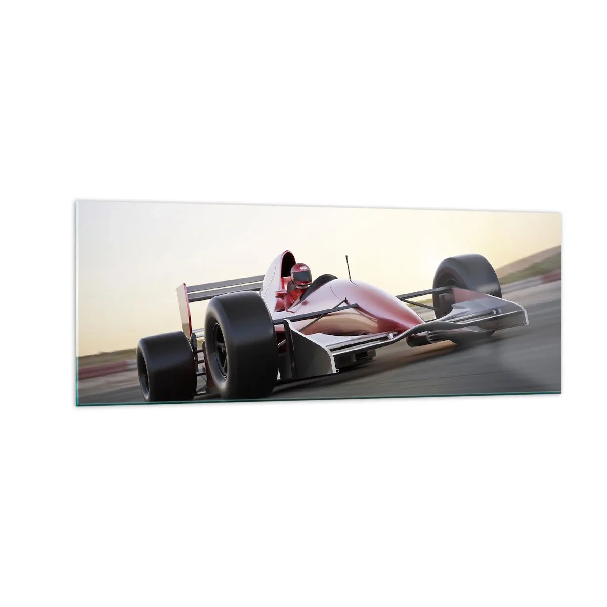 Obraz na szkle - Czerwony bolid Formuły 1 na torze wyścigowym w trakcie jazdy - 140x50cm - Zawsze zwycięzca - Nowoczesna dekoracja ścienna do salonu i sypialni ARTTOR