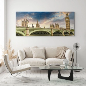 Obraz na szkle "Big Ben i Westminster Bridge o zachodzie słońca" to wyjątkowa dekoracja, która przenosi widza w sam środek urokliwego krajobrazu Londynu. Motyw ukazuje słynny Big Ben i majestatyczny Westminster Bridge na tle zachodzącego słońca, które malowniczo oświetla budynki i rzekę Tamizę. Ta kompozycja łączy w sobie historyczny urok i ponadczasową elegancję angielskiej architektury.
