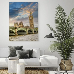 - Obraz przedstawia kultowy Big Ben i Westminster Bridge w Londynie o zachodzie słońca, tworząc atmosferę elegancji i uroku angielskiej architektury.