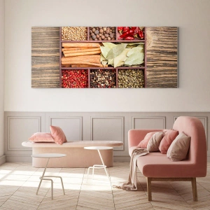 Obraz na szkle "Kolorowe przyprawy w drewnianych przegródkach" to niezwykła dekoracja, która łączy w sobie sztukę i kulinarną inspirację. Motyw przedstawia różnorodne przyprawy, w tym pieprz czarny, czerwony i zielony, cynamon, liście laurowe, kolendrę oraz suszone chilli, estetycznie rozmieszczone w drewnianych przegródkach. Ciepłe barwy przypraw i naturalny wygląd drewna tworzą harmonijną kompozycję.