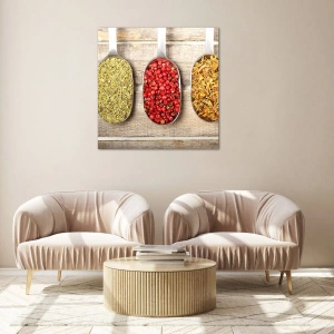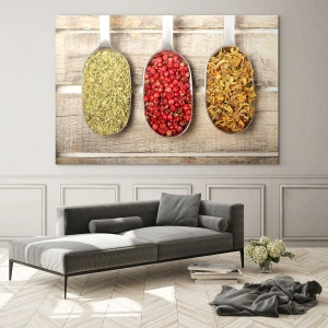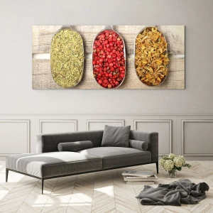 Obraz na szkle - Trzy łyżki z przyprawami na drewnianym tle w stylu rustykalnym - 100x70cm - Kuchenna magia - Nowoczesna dekoracja ścienna do salonu, kuchni i sypialni ARTTOR