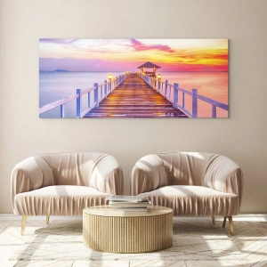 Obraz na szkle - Pomost nad wodą o zachodzie słońca w pastelowych barwach - 70x100cm - Liliowo-złota cisza wieczoru - Nowoczesna dekoracja ścienna do salonu i sypialni ARTTOR