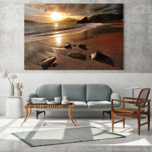 Obraz na ścianę - Idź za słońcem ku wzgórzom - Zachód słońca nad kamienistą plażą i wzgórzami