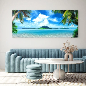 Obraz na szkle - Tropikalna plaża z palmami i widokiem na górzystą wyspę - 120x80cm - Lazur tropików - Nowoczesna dekoracja ścienna do salonu, kuchni i sypialni ARTTOR