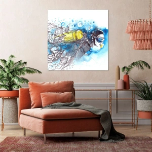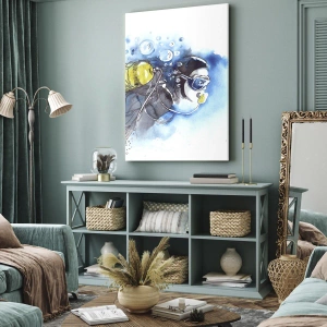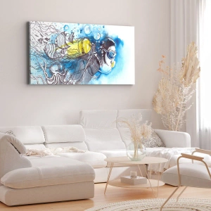 Obraz na płótnie "Wielki błękit" to wyjątkowe dzieło, które przenosi widza w magiczny świat oceanu. Akwarelowy styl ukazuje nurka otoczonego egzotycznymi rybami, koralowcami oraz delikatnymi bąbelkami, tworząc dynamiczną i harmonijną kompozycję. Motyw ten podkreśla piękno i tajemniczość podwodnego świata, inspirując do refleksji nad jego bogactwem i różnorodnością.