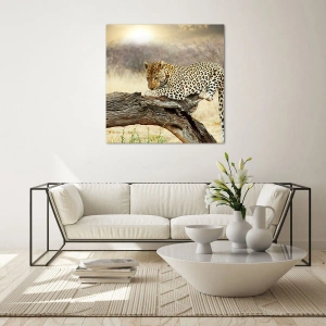 Obraz na szkle - Leopard odpoczywający na pniu wśród sawanny - 80x120cm - Chadzam własnymi drogami - Nowoczesna dekoracja ścienna do salonu i sypialni ARTTOR