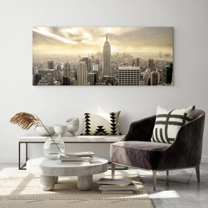 - Panorama miasta z centralnym widokiem na Empire State Building, otoczonego innymi nowoczesnymi wieżowcami. Ujęcie w ciepłych barwach tworzy przytulną atmosferę. Idealna dekoracja do salonu, biura czy sypialni.
