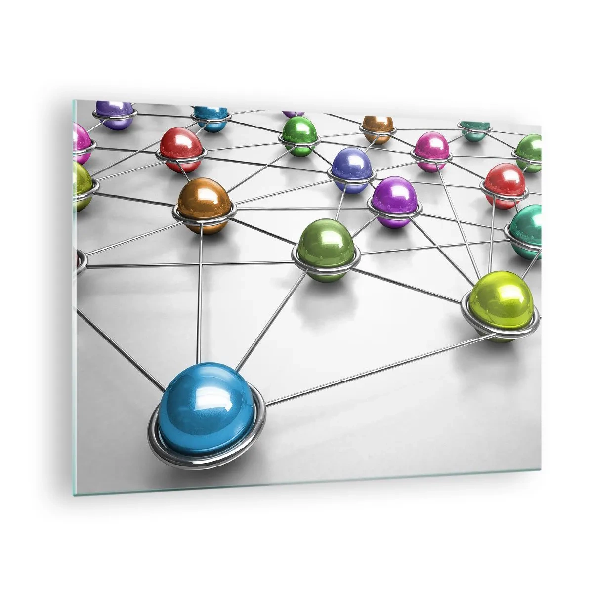 Obraz na szkle "Kosmiczna pajęczyna" to nowoczesna dekoracja, która zachwyca swoim geometrycznym i estetycznym designem. Kolorowe, błyszczące kule, połączone cienkimi liniami, tworzą harmonijną i dynamiczną kompozycję, która doskonale wpisuje się w styl współczesny. Jasne tło nadaje całości lekkości, a połączenie elementów symbolizuje współpracę, interakcję i kreatywność.